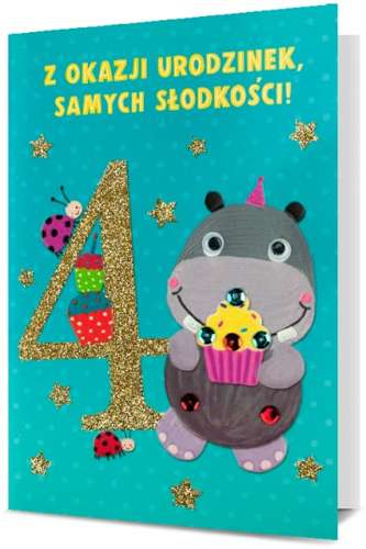 "Hurra! Twoje 4 urodzinki! Samych cudowności! Niech to będzie super dzień, pełen zabaw, przygód i słodkości. Niech spełnią się wszystkie Twoje marzenia! "