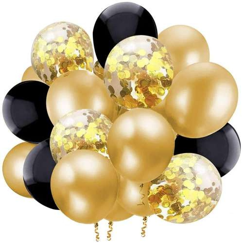 Bukiet składa się z balonów lateksowych w kolorze czarnym i złotym metalicznym x 10 szt, oraz balonów krystalicznych ze złotym konfetti x 5 szt