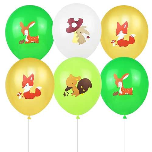 - 20 szt balonów lateksowych, wielkość 30 cm: 10 szt balonów kremowych, 10 szt balonów z nadrukami leśnych zwierząt