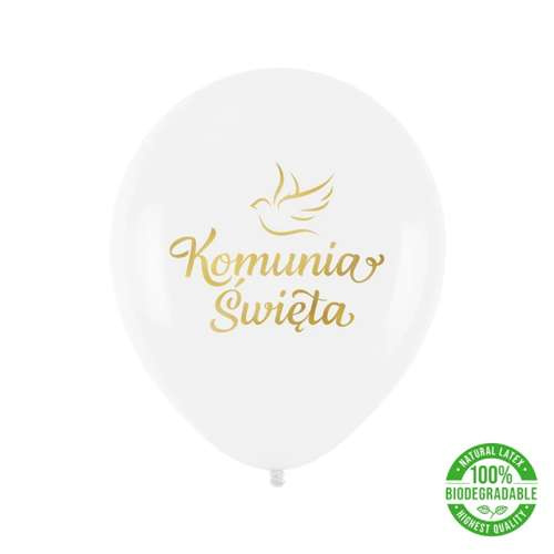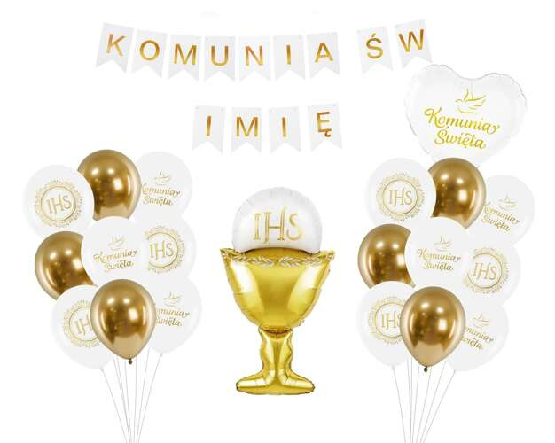 - balony lateksowe wielkość ok 30 cm: złote, białe z nadrukami komunijnymi x 18 szt